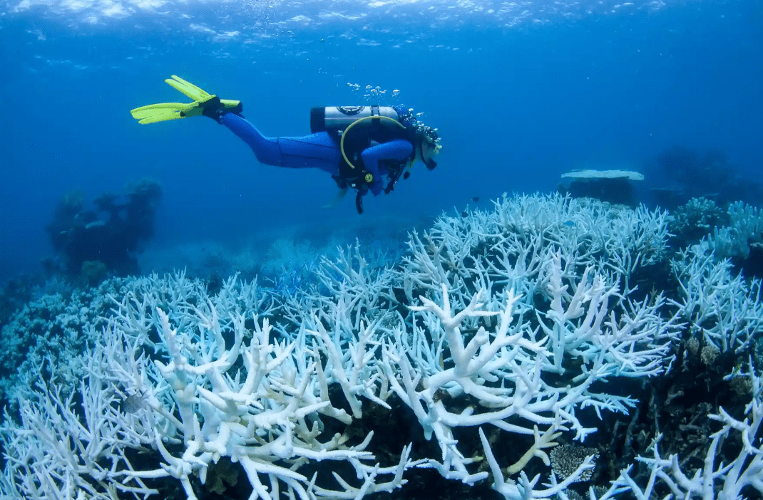 Морской ученый Чарли Верон, прозванный «крестным отцом кораллов» за свою новаторскую работу в этой области, сделал первую опубликованную фотографию обесцвеченных кораллов в начале 1980-х годов. В то время он думал, что это новый вид обычно красочного организма. Теперь мы знаем, что призрачные белые кораллы, как видно на этой фотографии , сделанной на Большом Барьерном рифе в 2017 году, являются явным предупреждением о том, что экосистема находится в бедственном положении.