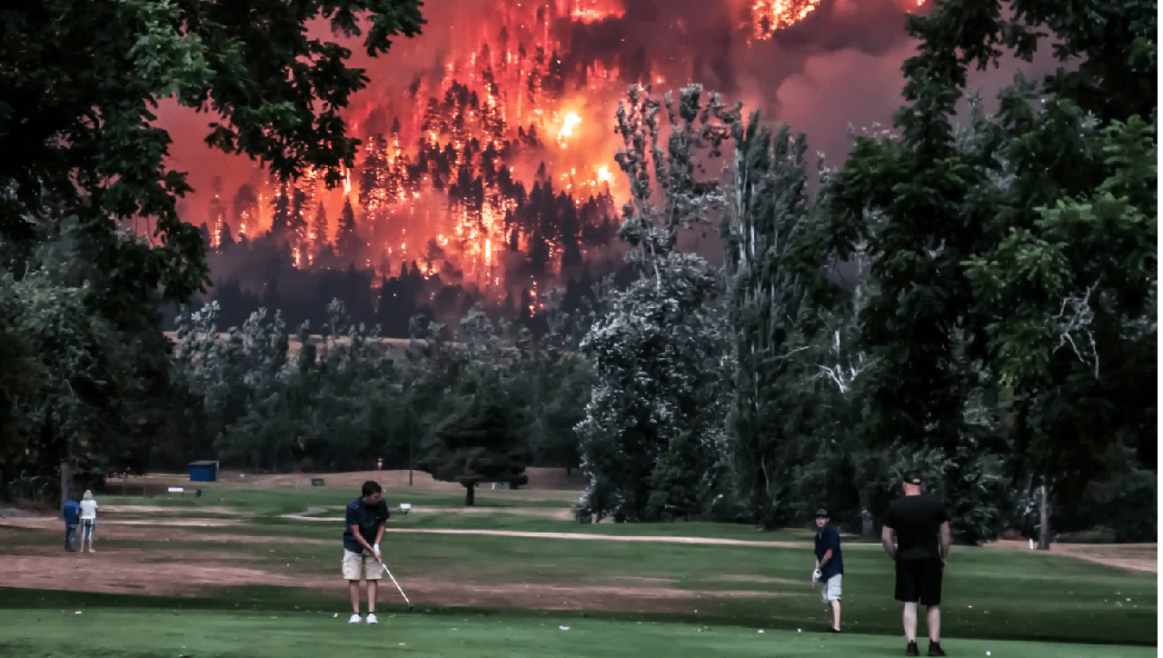 «В пантеоне визуальных метафор для Америки сегодня это денежный выстрел», — написал в Твиттере телесценарист (и создатель The Wire) Дэвид Саймон в ответ на этот образ игроков в гольф, спокойно играющих на фоне лесного пожара. Снимок был сделан местным фотографом-любителем Кристи Макклюер в 2017 году, на третий день пожара, охватившего ущелье реки Колумбия в Орегоне и Вашингтоне, горевшего в течение трех месяцев и выжегшего 50 000 акров земли.