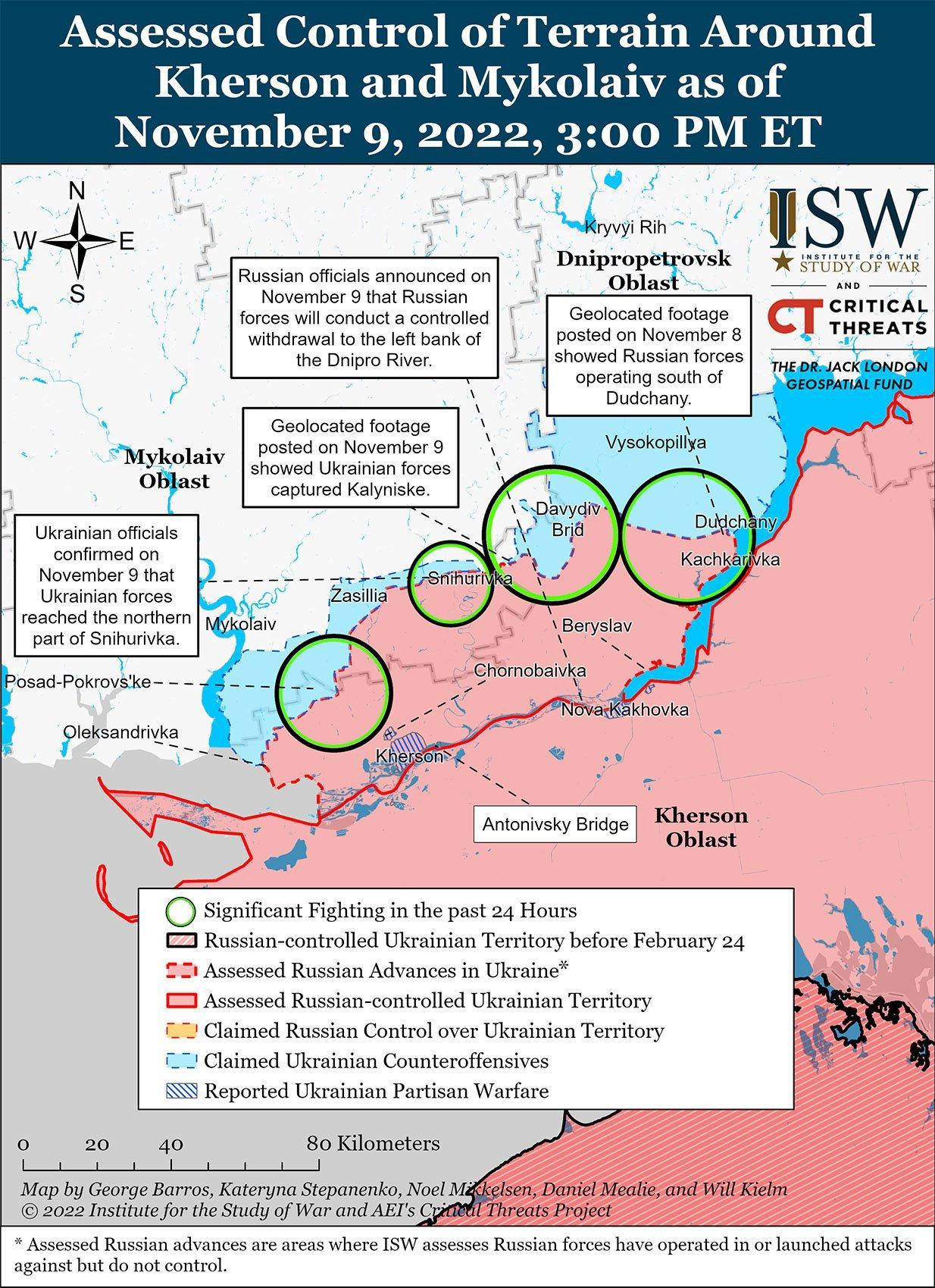 Геолоцированные снимки показывают, что российские войска разрушили мосты в районе Снигирёвки, что указывает на то, что российские войска проводят контролируемый вывод с позиций к северо-востоку от города Херсон в рамках более широкого отступления с западного берега Херсонской области. Известный российский милблогер сообщил, что российские войска подрывают мосты на ключевых маршрутах вывода и проводят контролируемый вывод войск из населенных пунктов к северо-западу и северо-востоку от Херсона. Министерство обороны России также продолжало утверждать, что российские войска отражали украинские атаки на севере Херсонской области к северо-западу от Берислава вокруг Садока, Качкаровки и Пятихатки.