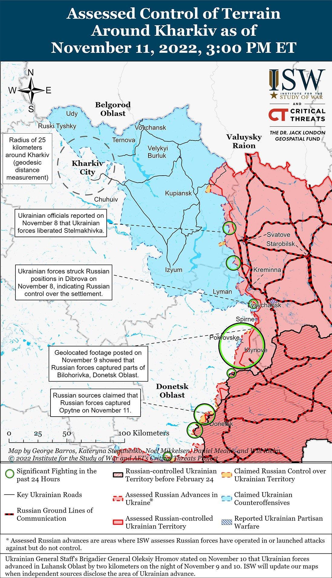 Российские источники утверждали, что украинские силы 11 ноября продолжили контрнаступление в направлении Кременной и Сватово. Министерство обороны России (МО) заявило, что российские войска отразили украинские атаки в 28 км к северо-западу от Сватово возле Ягодного, Кисловки и Владимировки в Харьковской области. Российский милблогер утверждал, что украинские войска вели штурм российских опорных пунктов в Куземовке (13 км к северо-востоку от Сватово) и ротировали личный состав на линии Песчано-Стельмаховка. Министерство обороны России также утверждало, что российские войска отбили украинские войска в 17 км к северо-западу от Кременной вблизи Червонопоповки и Площади. Однако на видео, опубликованном 11 ноября, видно, как российский военнослужащий утверждает, что украинские войска накапливаются в Червонопоповке. 11 ноября российский милблогер заявил, что российские войска открыли огонь по украинским силам, ротирующим личный состав в районе Невское-Терны к западу от Кременной. Генеральный штаб Украины сообщил, что украинские войска отразили российские атаки в 15 км к северо-западу от Сватово вблизи Новоселовского и Мясожаровки, в 22 км к северо-западу от Кременной возле Макеевки и в 12 км к югу от Кременной возле Белогоровки. В Луганской областной администрации сообщили, что в районах вблизи Лисичанска идут ожесточенные бои. Российские войска проводили контратаки на востоке Харькова и западе Луганской области, вероятно, намереваясь ограничить действия украинских сил вместо того, чтобы вернуть ограниченную территорию.