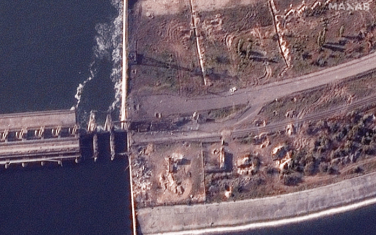 Более близкий вид повреждений поврежденного участка плотины Новая Каховка 11 ноября. Источник: Спутниковый снимок ©2022 Maxar Technologies