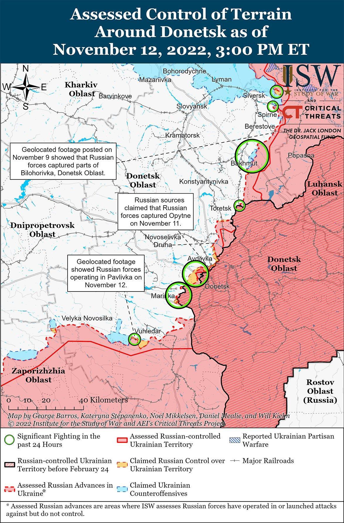 Российские войска провели наземные атаки вблизи Северска, Бахмута и Авдеевки 12 ноября. Украинский Генеральный штаб сообщил, что украинские войска отразили российские наземные атаки к востоку от Северска возле Верхнекаменского, возле Соледара и возле Бахмута. Российский источник утверждал, что российские войска захватили железнодорожный вокзал Майорск к югу от Бахмута. На геолоцированных кадрах видно, как украинские войска штурмуют российские позиции к востоку от Бахмута вдоль трассы Т0504. Генеральный штаб Украины сообщил, что украинские войска отразили российские наземные атаки к западу от Авдеевки в районе Первомайского и к юго-западу от Авдеевки вблизи Невельского, Красногоровки и Марьинки. Российские источники утверждали, что в районе Первомайского и южнее Авдеевки вблизи Опытного продолжаются бои.