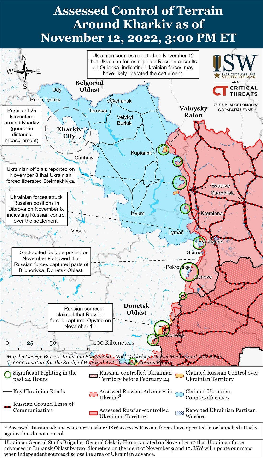 Российские источники утверждали, что украинские силы 12 ноября продолжили контрнаступление в направлении Кременной и Сватова. Министерство обороны России заявило, что российские войска отразили украинские атаки в 15 км к северо-западу от Сватово вблизи Владимировки и Куземовки Луганской области. Министерство обороны России сообщило, что российские войска также нанесли поражение украинским войскам артиллерийским огнем в окрестностях Песчан Харьковской области (24 км к северо-западу от Сватово). Министерство обороны России также сообщило, что действия России отразили украинские атаки в направлении Сватово и в 21 км к северо-западу от Кременной в направлении Плоски, Макеевки и Червонопоповки. Генеральный штаб Украины сообщил, что украинские войска отразили российские атаки в 30 км к северо-западу от Сватово вблизи Масютовки и Орлянки в Харьковской области, а также вблизи Мясожаровки и Новоселовского в Луганской области. Генеральный штаб Украины также сообщил, что украинские войска отразили российские наземные атаки в 21 км к северо-западу от Кременной вблизи Макеевки и в 12 км к югу от Кременной возле Белогоровки. Российские силы проводили эти контратаки, вероятно, для сдерживания действий украинских сил в восточной части Харьковской и западной части Луганской областей, а не для восстановления ограниченной территории. Украинские источники сообщили, что российские войска продолжали регулярные ракетные и артиллерийские удары на востоке Украины.