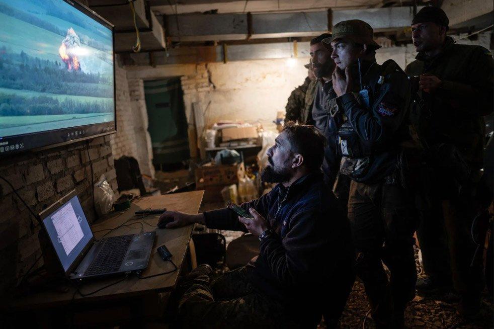 Солдаты украинского батальона «Карпатская Сечь» просматривают кадры с беспилотников за линией фронта в мае. Фото…Линси Аддарио для The New York Times
