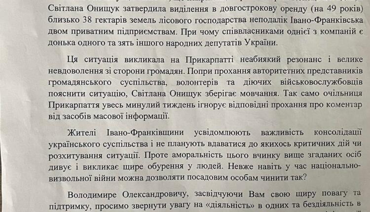 Нагадаємо, що наприкінці вересня керівник обласного управління лісогосподарства Сергій Кокоць погодив, голова ОВА Світлана Онищук підписала розпорядження про виділення близько 38 гектарів лісових земельних ділянок без проведення конкурсу. Також у ЗМІ повідомлялося про спробу Калуського лісгоспу передати підприємству з Львівщини в оренду на 5 років спецтехніку.