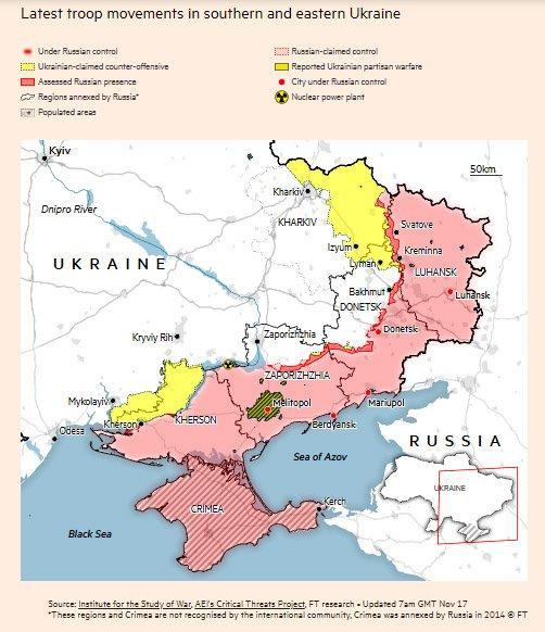 Источник: Институт изучения войны, Проект критических угроз AEI, исследование FT • Обновлено 17 ноября, 7:00 по Гринвичу.