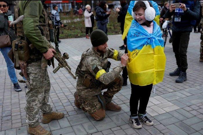 Украинский солдат дает автограф на флаге жителя Херсона. Генерал Валерий Залужный стоял за медленным истощением, которое вызвало отступление © русских Мурад Сезер / Reuters