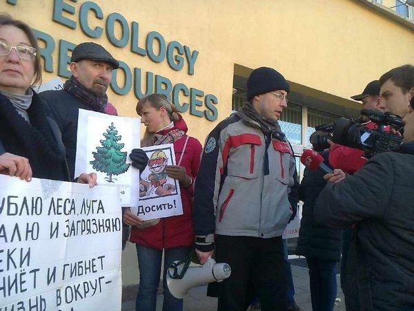 Но фото – представители общественных экологических организаций пикетируют Минприроды Украины с требование запрета санитарных рубок в заповедниках и заповедных зонах