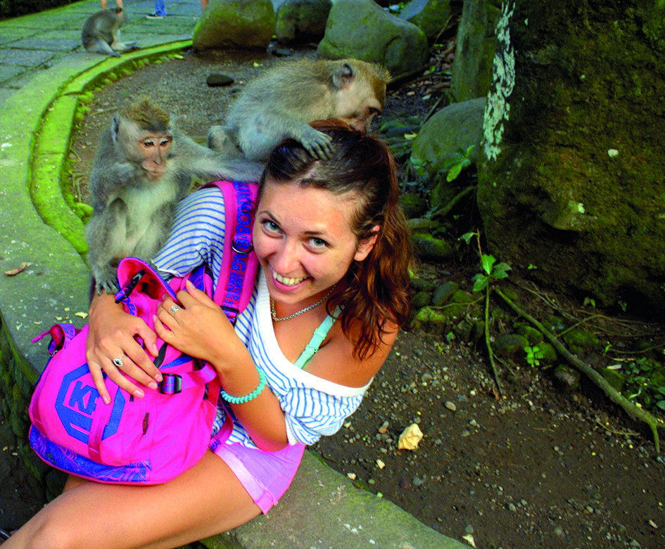 Оксана з посмішкою пригадує прогулянку в Лісі Мавп (Sacred Monkey Forest Sanctuary). Навколишня місцевість приваблює таємничістю і красою. Пройтися мостом у вигляді драконів, помилуватися скульптурами богів та духів Балі, фонтанами, спуститися вниз до невеликого водоспаду… А тим часом енергійні і спритні ссавці бігають на волі. Треба бути обережним, щоб не проґавити частини свого гардеробу.