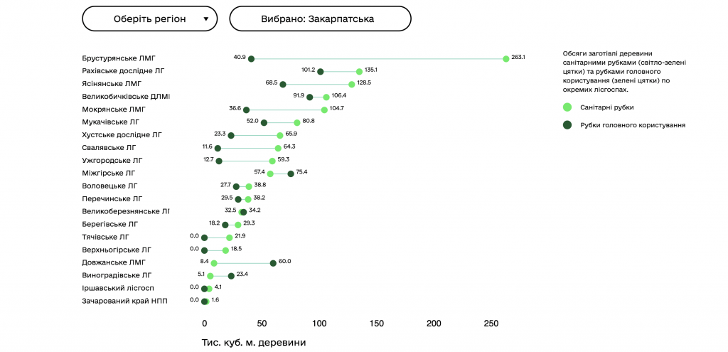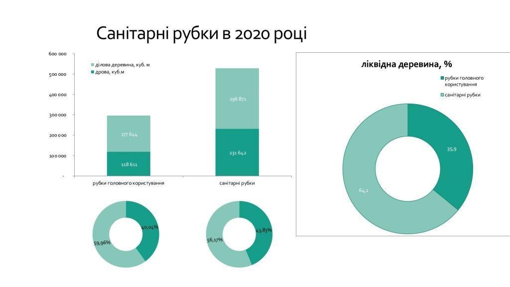 В Закарпатті, зокрема, як зазначає видання texty.org.ua, у 2020 році обсяги заготівлі деревини санітарними рубками були більшими, ніж рубками головного користування – які безпосередньо для цього призначені.