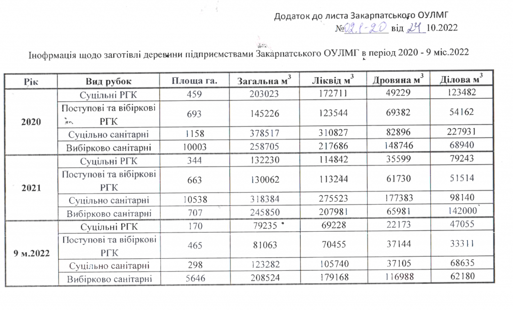 У відповіді на наш запит, Закарпатське лісо-мисливське господарство подало інформацію щодо об’ємів заготівлі деревини санітарними рубками та рубками головного користування у 2020, 2021 та 2022 роках.