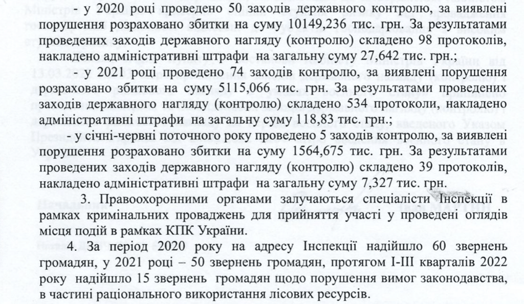 У 2020 році Держекоінспекцією було проведено 50 заходів держконтролю, накладено адміністративних штрафів на суму більше 27 тисяч грн, у 2021 році – на суму майже 119 тисяч грн і за період січня-червня 2022 року загальна сума шрафів за порушення вимог природоохоронного законодавства становить всього лиш 7 тис гривень.