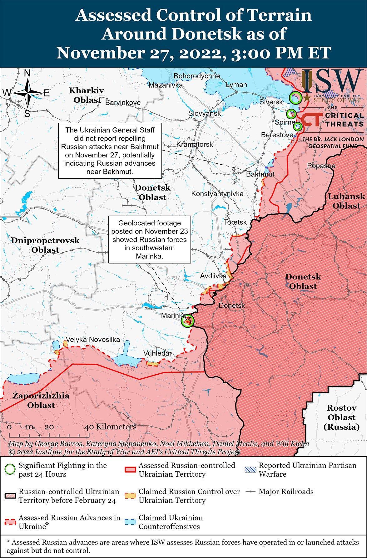 - Российские войска продолжали наступательные операции вокруг Авдеевки. Украинский Генеральный штаб не сообщил, что украинские войска отразили какие-либо наземные атаки вокруг Бахмута 27 ноября, предполагая, что российские войска, возможно, продвинулись в этом районе.