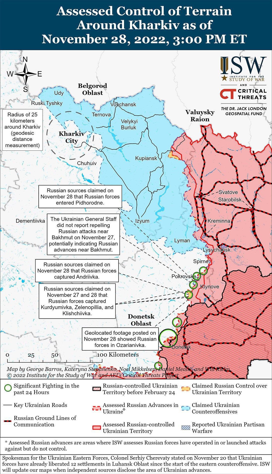 Недавние заявления о российских завоеваниях вокруг Бахмута 27 и 28 ноября не предвещают неминуемого российского окружения Бахмута. Геолоцированные снимки показывают, что российские войска, вероятно, захватили Озаряновку (село примерно в 15 км к юго-западу от Бахмута) около 27 и 28 ноября. Многочисленные российские источники утверждали, что российские войска также захватили Курдюмовку (13 км к юго-западу от Бахмута), Клишковку (7 км к юго-западу от Бахмута), Андреевку (10 км к юго-западу от Бахмута), Зеленополье (13 км к югу от Бахмута), Подгородное (5 км к северо-востоку от Бахмута) и Спирне (30 км к северо-востоку от Бахмута) с намерением окружить Бахмут с юга и востока. В настоящее время нет никаких доказательств из открытых источников, подтверждающих эти утверждения. Российские источники, в частности, распространяют ложные утверждения о достижениях вокруг Бахмута в рамках продолжающейся информационной операции с октября, и недавние необоснованные территориальные претензии могут быть частью этой продолжающейся информационной операции. Однако, даже если российским войскам действительно удалось взять под контроль населенные пункты к югу от Бахмута, эти достижения не угрожают критически важным маршрутам T0513 (Бахмут-Северск) и T0504 (Бахмут-Константиновка), которые служат основными украинскими наземными линиями коммуникаций (ГЛОК) в Бахмут. Существует также сеть небольших сельских дорог, которые соединяются с Бахмутом через северо-запад города. Заявленные российские позиции, ближайшие к Бахмуту в Клищеевке и Подгородном, ведут непосредственно к подготовленной украинской обороне в Бахмуте и его западных и северных населенных пунктах. Русские войска в Клищеевке, чтобы продвинуться дальше, должны были пересечь три километра полей с небольшим укрытием. Российские войска в их нынешнем деградировавшем состоянии, вероятно, не смогут быстро выполнить эту задачу. Сам финансист группы Вагнера Евгений Пригожин в октябре заметил, что силы Вагнера, действующие в районе Бахмута, продвигаются только на 100–200 метров в день. Таким образом, заявленные Россией успехи вокруг Бахмута в течение 27 и 28 ноября вряд ли приведут к эффекту на оперативном уровне и, конечно, не быстро.