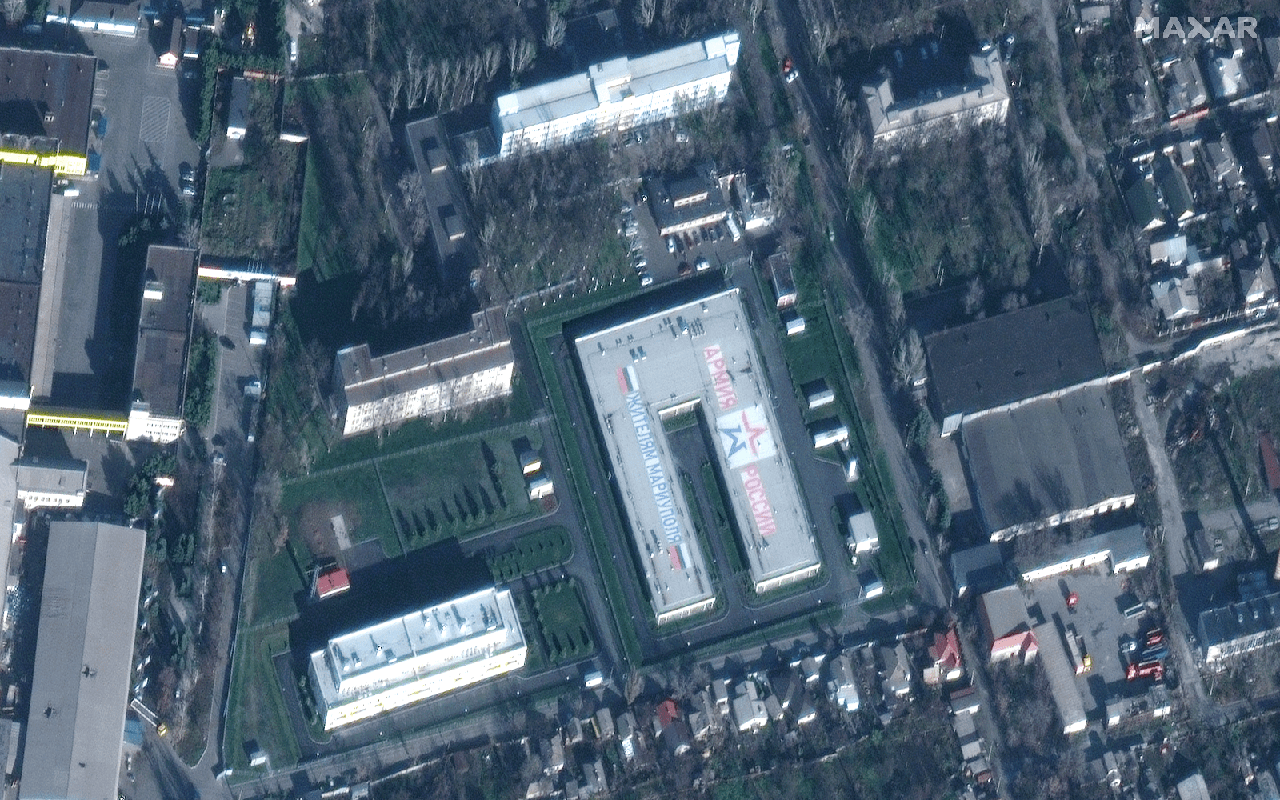 Создание российскими военными базами в разрушенном Мариуполе еще больше делает абсурдным нарратив Путина о «развитии гражданского проекта». Сальдо утверждал, что российские власти осуществляют проекты развития Генического района и Арабатской стрелки такими же темпами, как и превращение разрушенного Мариуполя в курортный город[79]. На спутниковых снимках Maxar Technologies от 30 ноября видно, что российские войска построили новый военный комплекс в северной части Мариуполя с армейским лозунгом, нарисованным на крыше. На других спутниковых снимках видны разрушенные жилые дома и жалкие российские попытки скрыть разрушенный Мариупольский драматический театр в центре города экранами вокруг здания. Такие изображения несовместимы с заявленным Кремлем планом развития туризма.