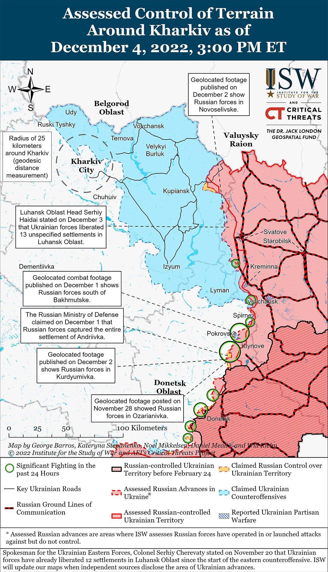 Российские источники сообщили, что украинские силы 4 декабря продолжили контрнаступление в направлении Сватово. Министерство обороны России заявило, что российские войска сорвали украинские атаки в 28 км к северо-западу от Сватово возле Куземовки в Луганской области и Ягодное в Харьковской области. На геолоцированных кадрах, опубликованных 4 декабря, видно, как украинские войска наносят удары по российским позициям к северо-западу от Сватово возле Стельмаховки и Кривошеевки в Луганской области. Российский милблогер утверждал, что украинские силы, скорее всего, усилят наступление на Куземовку, а также на трассу Р-66 между Сватовым и Кременной. ISW не дает никаких оценок относительно конкретных, будущих украинских операций.