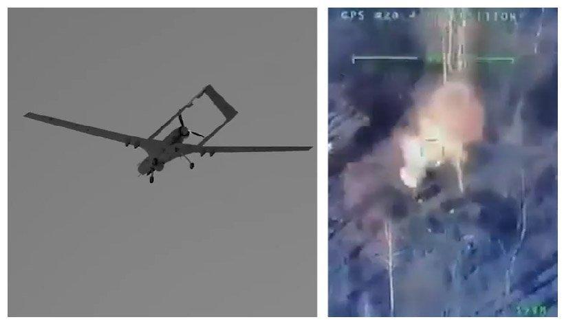 Слева: летает турецкий Bayraktar TB2. Справа: Bayraktar TB2 турецкого производства наносит удар по российскому зенитно-ракетному комплексу в Украине 28 февраля. (Видео: Министерство обороны Украины и Вооруженные силы Украины через Storyful)