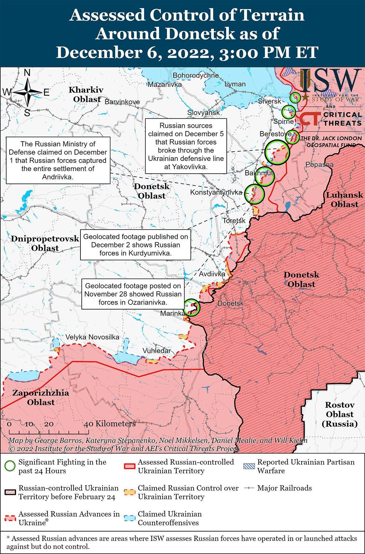 Российские источники утверждали, что российские войска добились незначительных успехов вокруг Бахмута 5 и 6 декабря. Пресс-секретарь Донецкой Народной Республики (ДНР) Даниил Безсонов заявил, что силы Вагнера наступают в районе Бахмута, нанося большие потери украинским силам. Министерство обороны России заявило, что 6 декабря российские войска отразили украинские атаки возле Курдюмовка (13 км к юго-востоку от Бахмута), что привело к большим украинским потерям. Российские милблогеры утверждали 5 и 6 декабря, что силы Вагнера прорвались через украинскую оборону вокруг Опытное (4 км к югу от Бахмута) и к юго-востоку от Бахмута и пытаются установить контроль над поселением, но финансист Вагнера Евгений Пригожин опроверг эти утверждения 6 декабря. Российские милблогеры утверждали, что 6 декабря бои в районе Соледар (13 км к северо-востоку от Бахмута), Бахмута, а также в Опытное, Клищеевка и Курдюмовка (все три в пределах 14 км к югу от Бахмута) оставались ожесточенными. Бывший министр безопасности ДНР Александр Ходаковский отметил, что у россиян нет преимущества шокировать ничего не подозревающих украинских сил в Бахмуте, как это было во время осады Мариуполя в марте. Ходаковский утверждал, что российские войска делают незначительные успехи вокруг Бахмута, но отметил, что расположение линии фронта и многомесячное сопротивление Украины мешают российским силам добиться масштабных успехов на Бахмутском направлении.
