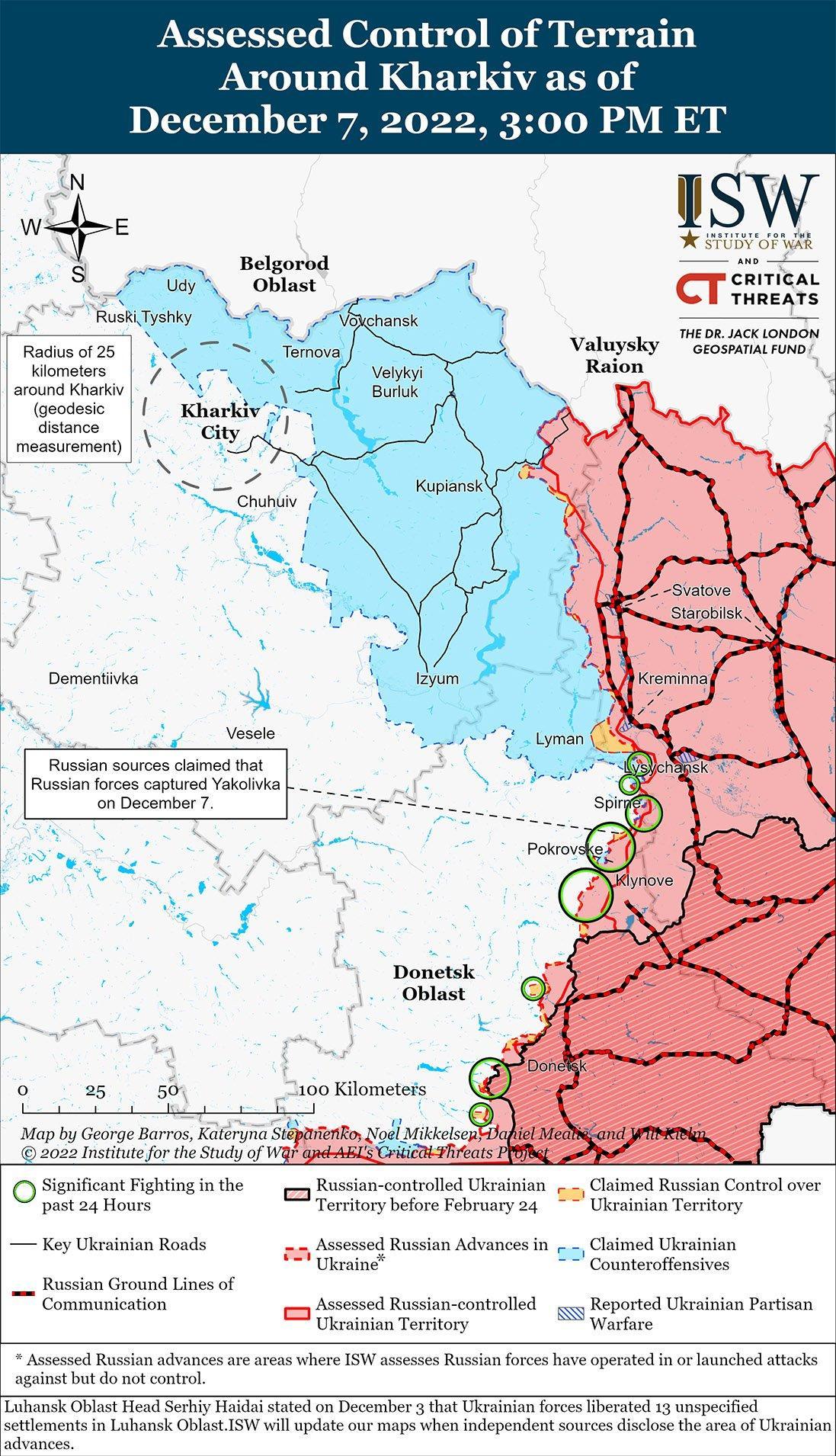 Российские войска, вероятно, наращивают темпы контратак на востоке Харькова и западе Луганской области. Пресс-секретарь Восточной группы войск Украины Сергей Череватый заявил 7 декабря, что российские войска готовят контрнаступлительную операцию на западе Луганской области, часть которой будет включать операции в направлении Купянска. Череватый заявил, что украинские силы активно противодействуют российским контратакам в районе Сватово, а также в других местах. 6 декабря российский милблогер заявил, что российские войска ведут контратаки по всей линии Сватово-Кременского фронта. 7 декабря Министерство обороны России заявило, что российские войска продолжают наступательные операции в направлении Лимана. Российские войска, возможно, готовятся к усилению темпов контратак в восточной части Харькова и западной части Луганской области, чтобы упредить украинские силы от увеличения темпов их восточного контрнаступления, поскольку условия становятся более благоприятными для механизированной маневренной войны на востоке Украины из-за зимы.