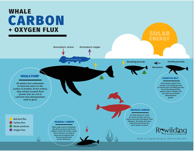 Киты также играют замечательную роль в повышении способности океанов накапливать углерод. Глубоко ныряя, чтобы поесть криля, а затем возвращаясь на поверхность, чтобы дышать и испражняться, они приносят растворенные питательные вещества, особенно железо и азот, в светлую зону, которая составляет первые 25 м (82 фута) водного столба. Эти питательные вещества затем стимулируют рост фитопланктона и других морских растений, которые используют фотосинтез для удаления углерода из атмосферы. Эти приповерхностные вегетативные цветы, в свою очередь, кормят ночных посетителей мезопелагических рыб.