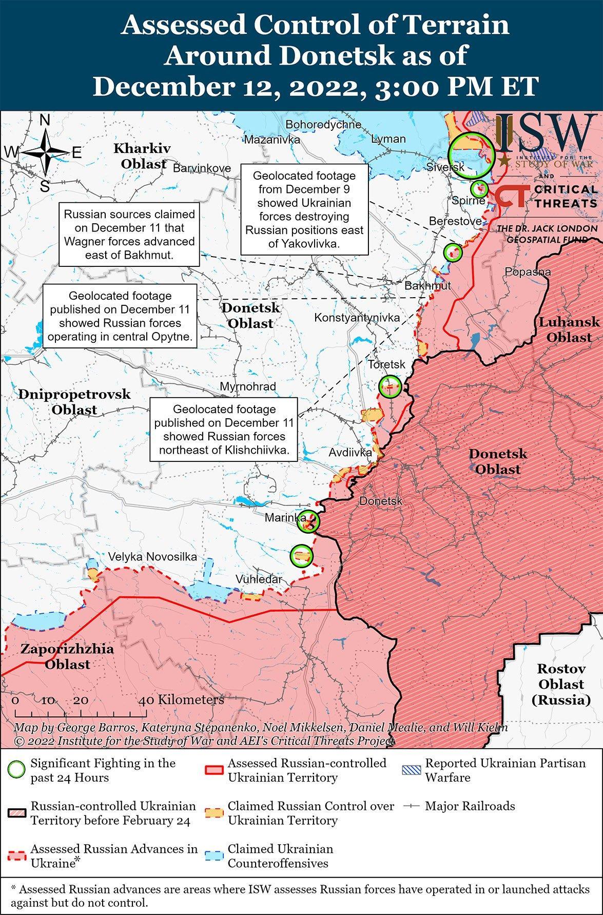 Российские войска продолжали наземные атаки вокруг Бахмута 11 и 12 декабря. Неназванный военный чиновник США заявил, что группа Вагнера и российские войска ведут интенсивные бои за Бахмут и выделяют значительные ресурсы для поддержания темпов, но отметил, что украинские силы «продолжают удерживать линию». Пресс-секретарь Восточной группы войск Украины полковник Сергей Череватый заявил, что российские войска изменили состав тактических сил на Бахмутском направлении, перейдя от использования ротных и батальонных тактических групп (БТГ) к использованию штурмовых подразделений для выполнения чисто наступательных задач. Генеральный штаб Украины сообщил, что 11 и 12 декабря украинские войска отразили российские атаки вблизи Бахмута и населенных пунктов к северо-востоку от города Белогоровка, Верхнекамянское, Соледар, Бахмутское и Подгородное. Российские источники утверждали, что 12 декабря силы Вагнера штурмовали Подгородное, чтобы частично окружить Бахмут. Геолоцированные кадры показали разрушенный железнодорожный мост через автомагистраль Е40 (М-03) к северо-западу от Подгородного, который, по утверждению российских источников, является одной из двух оставшихся основных наземных линий коммуникаций (ГЛОК) в Бахмут. Российские источники утверждали, что украинские войска взорвали мост, чтобы создать искусственную баррикаду на трассе E40 в направлении Славянска. Российский источник также утверждал, что штурмовые отряды Вагнера установили контроль над двумя бывшими позициями украинского взвода на линии Бахмут-Соледар, приближающейся к шоссе, соединяющему населенные пункты, вероятно, имея в виду трассу Т1302. Российские источники также утверждали, что силы группы Вагнера продвинулись вблизи Опытное (3 км к югу от Бахмута) и что в этом районе продолжаются боевые действия. Российский источник утверждал, что силы группы Вагнера начали атаки из района Андреевки (9 км к юго-западу от Бахмута) против неуказанных населенных пунктов и утверждал, что боевые действия продолжаются к востоку от Бахмута, отметив, что украинские силы не отступают из города. Другой российский источник утверждал, что силы Донецкой Народной Республики (ДНР) пытаются продвинуться на восток в направлении Торецк (23 км к юго-западу от Бахмута) при артиллерийской поддержке.