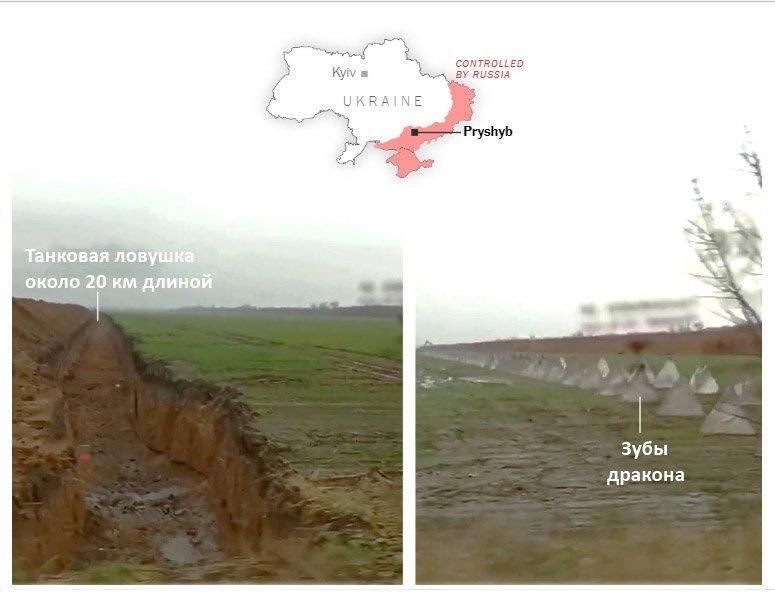 Среди защитных сооружений есть километровые ряды бетонных пирамид, известных как зубы дракона, и глубокие канавы, называемые танковыми ловушками. Оба предназначены для замедления украинских транспортных средств и вытеснения их на заданные позиции, где российские войска могут вести прицельный огонь по ним.