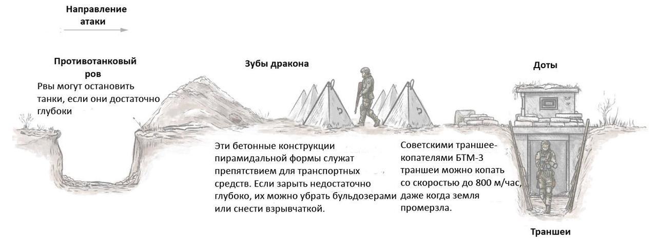 Иллюстрация основных оборонительных сооружений, построенных русскими на Украине: противотранспортная траншея, зубы дракона и доты.