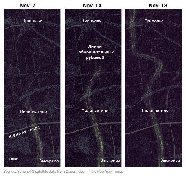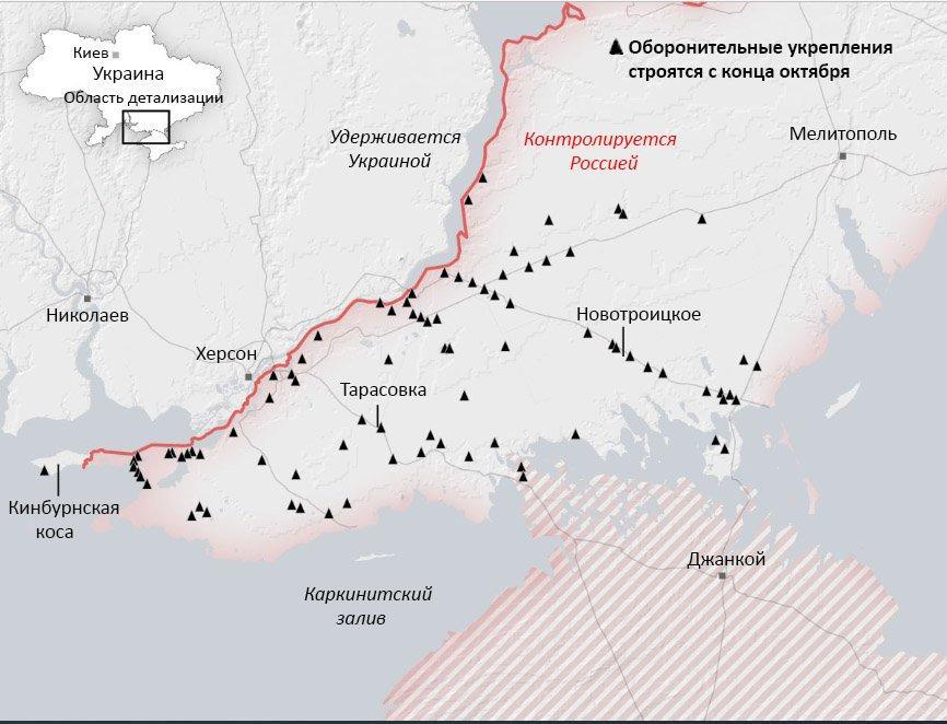 Российские укрепления гораздо дальше от линии фронта в Херсоне, чем на востоке Украины. Новые сооружения были замечены более чем в 50 милях от реки Днепр, которая теперь служит естественной преградой между двумя берегами.