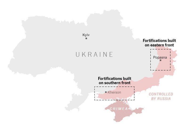 Карта Украины, показывающая территорию, оккупированную Россией, и где были обнаружены укрепления.