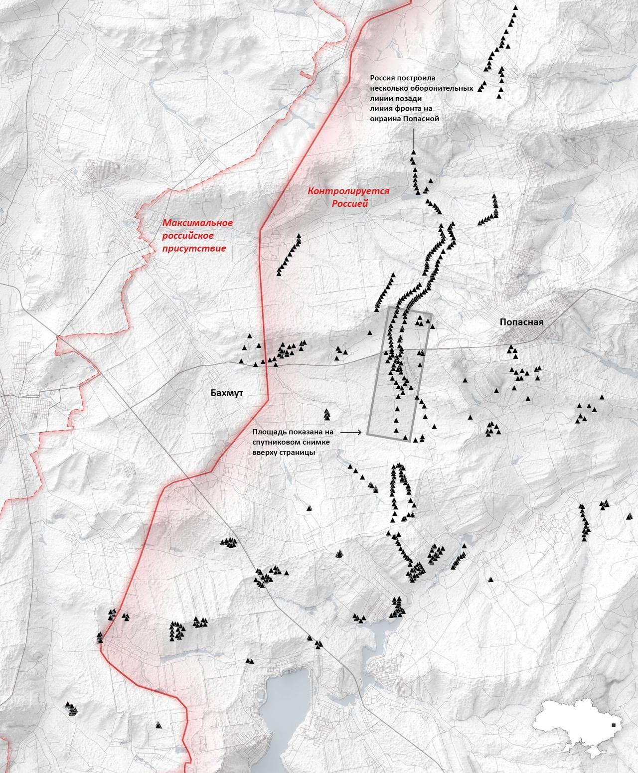 Россия продолжает наступление под Бахмутом, обстреливая город артиллерией и медленно продвигаясь к востоку и югу от города в течение последних двух недель. Новая конструкция обеспечивает несколько оборонительных позиций, на которые можно отступить в случае контратаки украинцев.