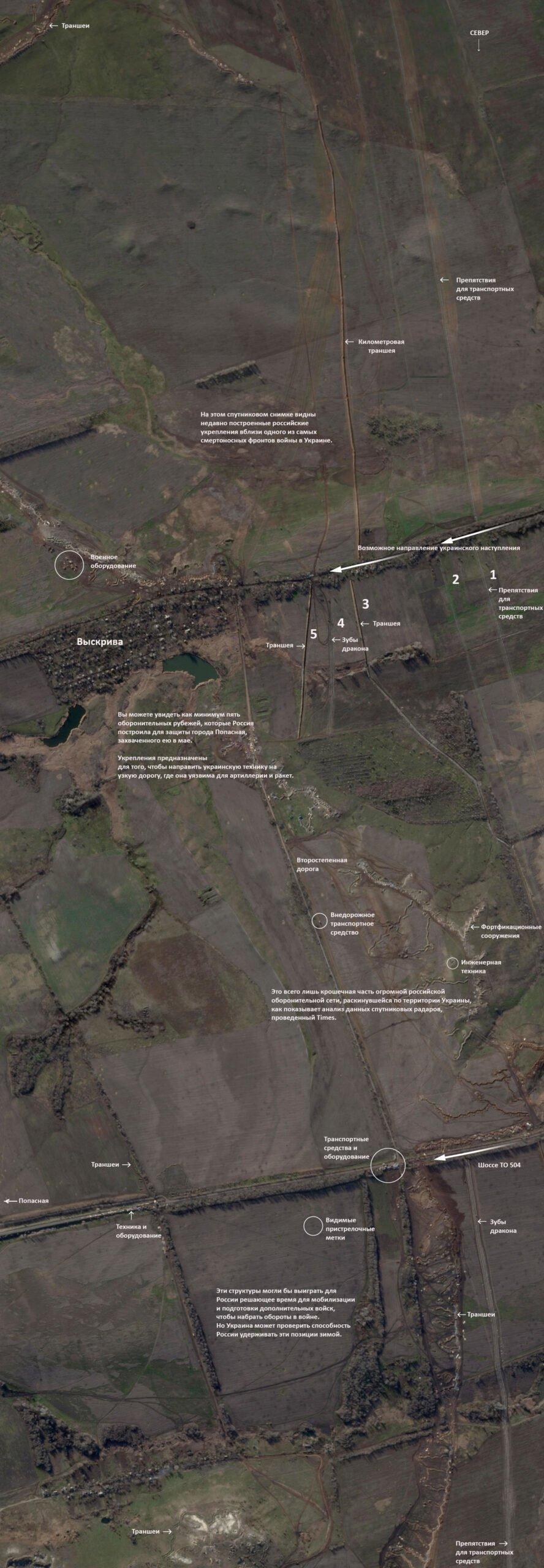 В прошлом месяце Украина отвоевала большую часть территории на юге, включая региональную столицу Херсон, отбросив российские войска через Днепр. Река служит естественным барьером, и Россия построила огромную серию оборонительных препятствий к югу от реки, чтобы помешать Украине пересечь ее.