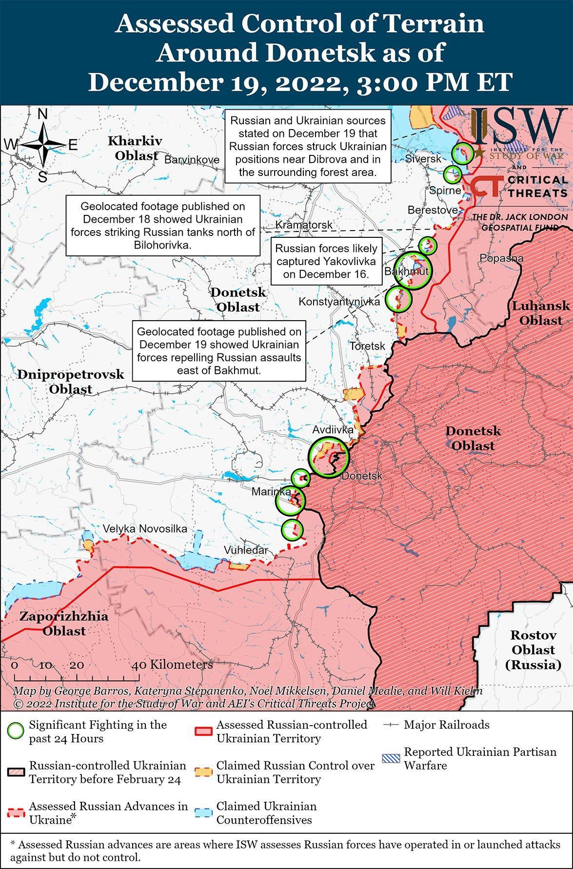 Российские войска продолжали наземные атаки вдоль западной окраины Донецка 18 и 19 декабря. Украинский Генеральный штаб заявил, что украинские войска отразили российские атаки возле Александрополь (15 км к северу от Авдеевки), Первомайское, Красногоровка и Невельское (все на северо-западной окраине Донецка), а также Марьинка, Победа и Новомихайловка (все на юго-западной окраине Донецка) в период с 18 по 19 декабря. Российские милблогеры сообщали о боях во многих из тех же районов и освещали операции 11-го гвардейского полка Донецкой Народной Республики (ДНР) и батальона «Сомали» в районах Пески и Первомайское к северо-западу от Донецка. Российские источники также широко утверждали, что российские войска прорвали украинскую оборону в центре Марьинки 18 декабря и продвигаются дальше на запад 19 декабря. Российские источники утверждали, что захват Россией Марьинки позволит российским войскам обойти Угледар на юго-запад и продвинуться на северо-запад к Курахово, которое, как сообщается, является крупным украинским транспортным узлом и железнодорожной линией. Российский милблогер, в частности, утверждал, что украинские войска вытеснили российские подразделения с позиций в Победе и установили контроль над опорными пунктами к югу от Марьинки. Российские источники утверждали, что 18 и 19 декабря украинские войска провели ограниченные контратаки, чтобы вернуть утраченные позиции к юго-западу от Донецка в районе Угледара. 18 и 19 декабря российские войска продолжали вести регулярный огонь в районе Авдеевка –Донецк, а также в западной части Донецкой и Восточной Запорожской областей.