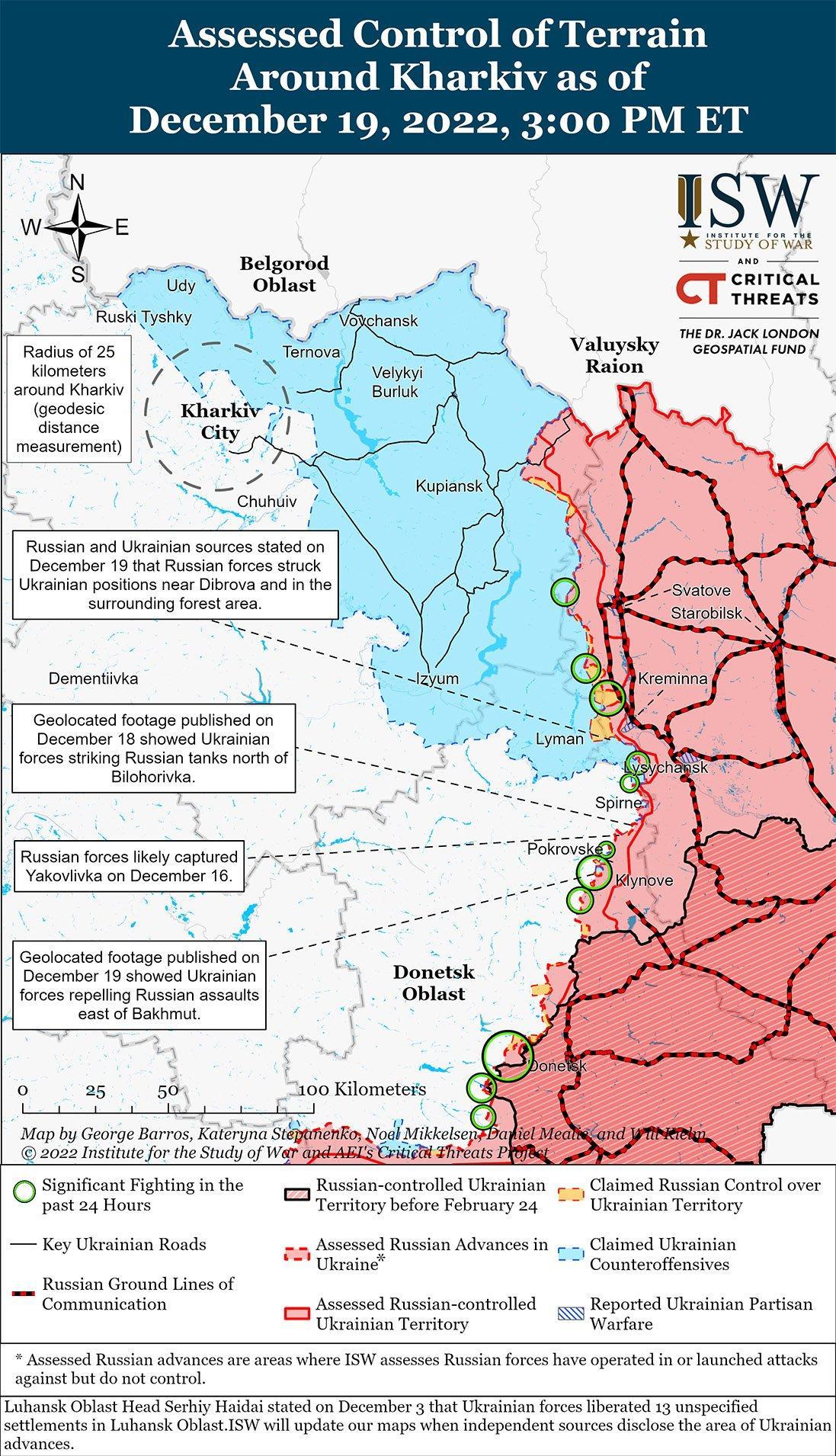 Российские войска продолжали ограниченные контратаки, чтобы вернуть утраченные позиции вдоль линии Сватово-Кременная 18 и 19 декабря. Украинский Генеральный штаб сообщил, что украинские войска отразили российские атаки возле Стельмаховка (15 км к западу от Сватово) в период с 18 по 19 декабря. Российский милблогер утверждал, что российские войска пытались продвинуться на Стельмаховку и Новоселовское (15 км к северо-западу от Сватово). Генеральный штаб Украины также заявил, что российские войска пытались атаковать украинские позиции в районе Кременной вблизи Червонопоповки (5 км к северу от Кременной), Макеевки (22 км к северо-западу от Кременной), а также вблизи Григоровки, Серебрянки и Белогоровки, примерно в 10 км к югу от Кременной. Министерство обороны России сообщило, что российская артиллерия нанесла удар по сосредоточению украинских сил вблизи Диброва (5 км к юго-западу от Кременной), что указывает на то, что украинские войска, возможно, продвинулись в этот район. Российские милблогеры отметили плохие условия для российских войск вдоль линии Сватово-Кременная и отметили, что российские солдаты, дислоцированные вблизи Сватово, страдают от заболеваний, связанных с плохой гигиеной и практикой оказания первой помощи в холодных и влажных условиях. Другой российский милблогер утверждал, что южная часть линии Сватово-Кременная «непроходима» из-за грязи и тумана.