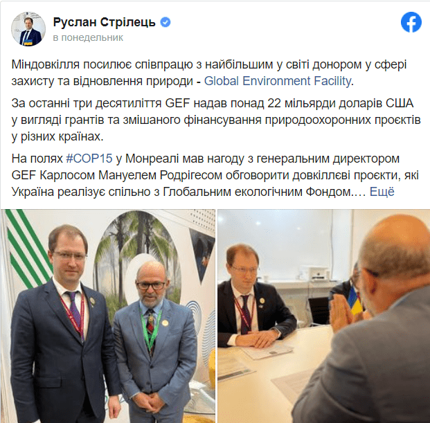 Усиление сотрудничества в совместных с Фондом проектах окружающей среды обсудили министр защиты окружающей среды и природных ресурсов Руслан Стрелец и генеральный директор GEF Карлос Мануэль Родригес, сообщает Стрелец в Facebook.