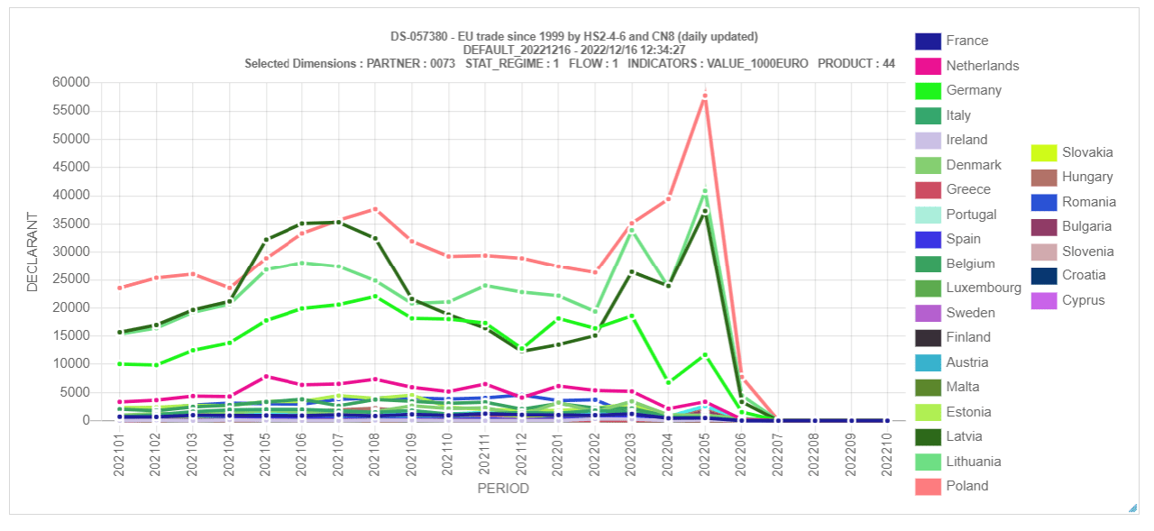 Импорт ЕС товаров с кодом 44 из Беларуси, данные Евростата