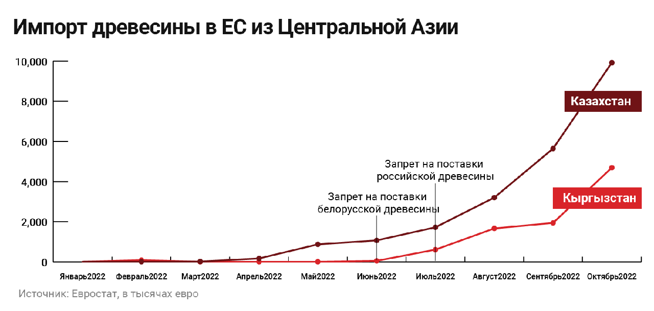 После начала действия санкций поставки древесины из Беларуси в ЕС, по данным Евростата, упали более чем в 30 раз, зато экспорт древесины из Казахстана вырос в 74 раза, а из Кыргызстана – в 18 тысяч раз по сравнению с тем же периодом 2021 года.