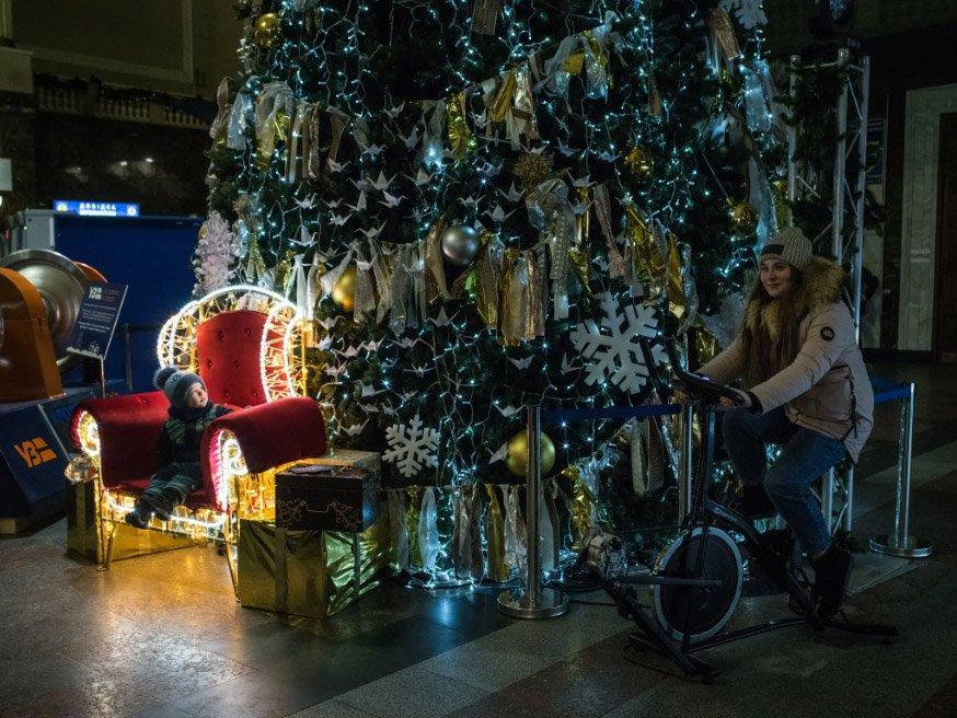 В Киеве, Украина, женщина крутила педали велосипедного генератора, чтобы включить огни на рождественской елке, выставленной на железнодорожном вокзале. Фото…Лаура Бушнак для The New York Times