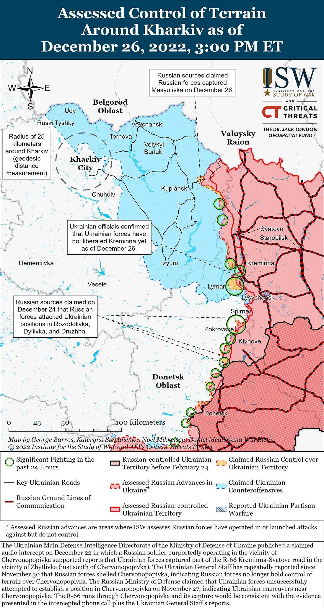 Российские и украинские войска продолжали наступательные действия вдоль линии Сватово-Кременная в период с 25 по 26 декабря. Украинский Генеральный штаб отметил, что украинские войска отразили российские атаки вблизи Площадь (16 км к северо-западу от Кременной), Червонопоповки (5 км к северу от Кременной) и Невское (17 км к северо-западу от Кременной) 25 и 26 декабря. Российские милблогеры отмечали, что российские войска вдоль линии Сватово-Кременная состоят из мобилизованных частей московской области, а также частей 144-й мотострелковой дивизии 20-й общевойсковой армии Западного военного округа и 8-й общевойсковой армии Южного военного округа. Эта сводная группировка сил предполагает, что российские войска перетягивают войска из различных точек по всему театру военных действий, чтобы заполнить бреши на линии Сватово-Кременная и компенсировать продолжающуюся деградацию условных подразделений. Российские источники также утверждали, что украинские войска пытались атаковать российские позиции вблизи Кременной и что части Русского легиона и 8-й общевойсковой армии Южного военного округа отразили попытки Украины вблизи Кременной. Глава Луганской области Украины Сергей Гай 26 декабря отметил, что боевые действия ведутся «недалеко» от Кременной и что российское командование в Кременной эвакуировано в Рубежное, примерно в 10 км к юго-востоку от Кременной и далее за линией соприкосновения. Гайдай опроверг сообщения о том, что украинские войска освободили Кременную, и призвал к терпению. Российские милблогеры обвинили украинские источники в «завышении» заявлений об успехах под Кременной и назвали такие сообщения активной информационной операцией.