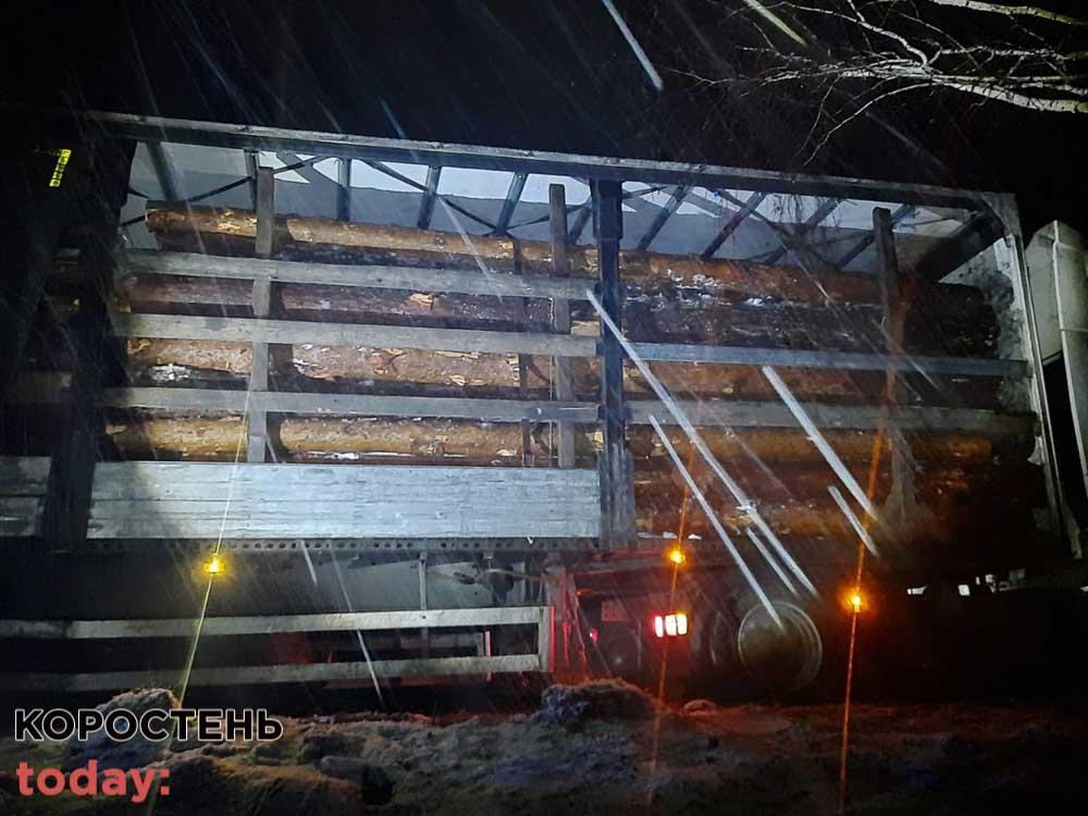 “Увечері поліцейські відділу організації діяльності груп реагування Управління превентивної діяльності ГУНП під час відпрацювання Коростенського району, поблизу с. Бондарівки, зупинили вантажівку з деревиною. За кермом транспортного засобу перебував 58-річний житель Олевської громади. Під час огляду правоохоронці виявили, що у причепі знаходяться соснові колоди обсягом близько 30 м3. Документів, що підтверджували б законність походження та перевезення деревини, керманич вантажівки не надав.
