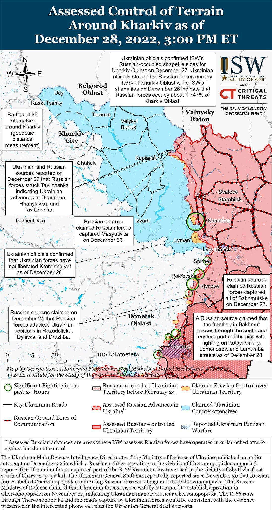Сообщается, что 28 декабря украинские силы продолжили контрнаступление в направлении Кременной. Российский милблогер утверждал, что украинские силы провели штурм возле Червонопоповки (6 км к северу от Кременной), где, как сообщается, ведутся бои между российскими и украинскими силами за участок трассы Р-66, которая ведет в Кременную. Пресс-секретарь Восточной группы вооруженных сил Украины Сергей Череватый заявил, что украинские войска продолжают проводить операции по освобождению Кременной, хотя и подчеркнул, что пока рано говорить о захвате населенного пункта. Украинские официальные лица сообщили, что российские гражданские работники и российское военное командование эвакуировались из Кременной, что, возможно, указывает на то, что российские войска готовятся к активизации украинских усилий по захвату поселения. Бывший посол Луганской народной республики (ЛНР) в России Родион Мирошник заявил, что украинские силовики продолжают вести долгосрочное методическое зондирование российских позиций в районе Кременной и несут большие потери в этих операциях. Источник, связанный с БАРС-13 (российский боевой резерв), утверждал, что украинские войска готовят наступление на Кременную одновременно с трех направлений. ISW не делает оценок относительно конкретных будущих операций Украины. Источник в социальных сетях опубликовал кадры 27 декабря, в которых утверждается, что украинские силы захватили Диброво (5 км к юго-западу от Кременной), хотя ISW не может независимо проверить это утверждение.