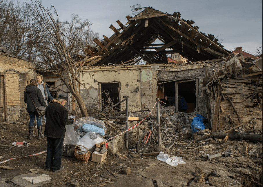 Соседи помогли убрать завалы с участка, поврежденного в канун Нового года в результате ударов России в Киеве, Украина. Россия использовала больше взрывающихся беспилотников, чтобы атаковать украинскую столицу рано утром в понедельник. Фото…Лаура Бушнак для The New York Times