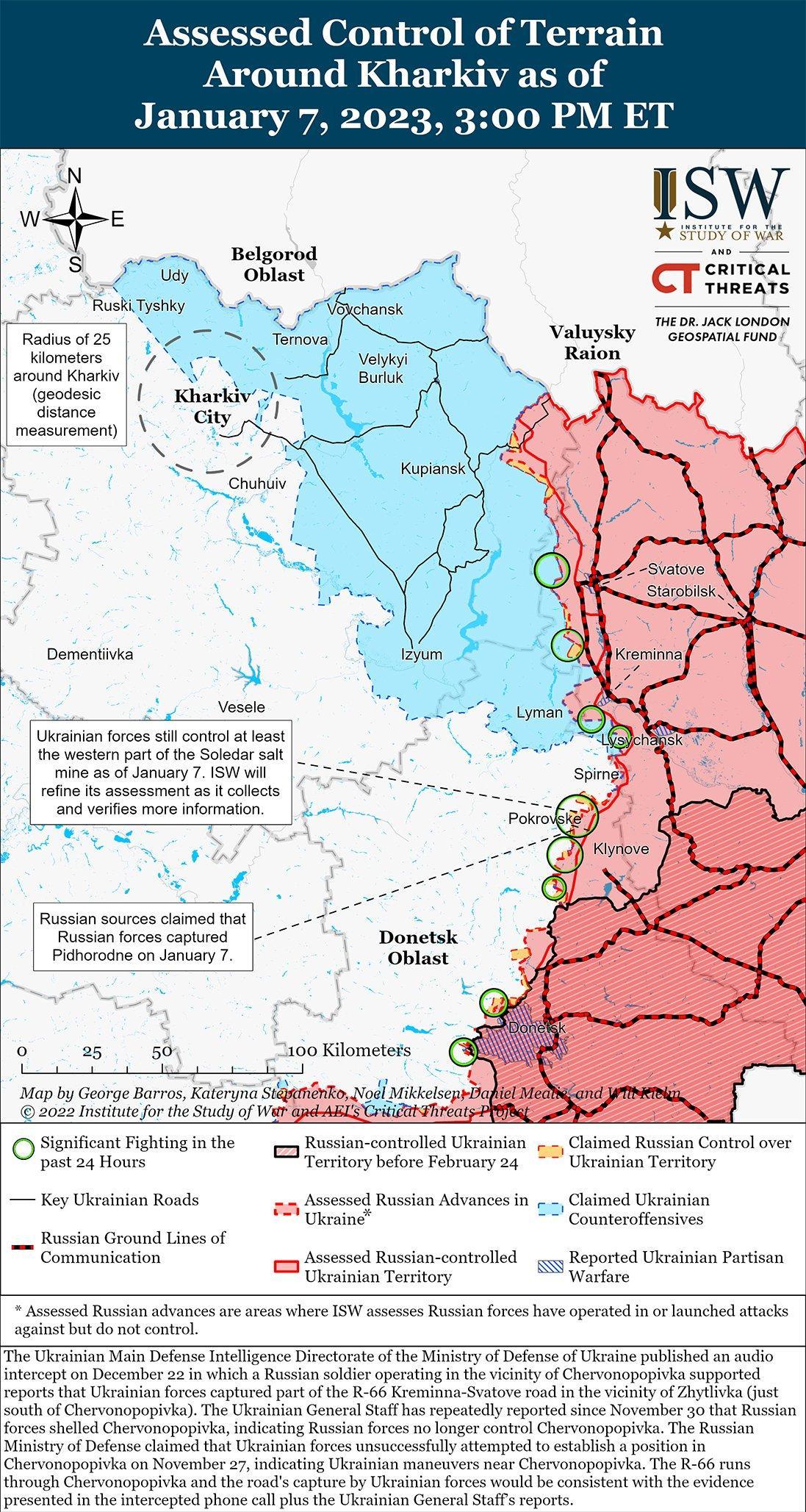 Российские войска сделали незначительные подтвержденные успехи в Соледаре, но украинские силы сохраняют контроль над поселением по состоянию на 7 января. Геолоцированные кадры показывают бойца группы Вагнера на заводе «Артемзол» в центре Соледара. Российские милблогеры также широко утверждали, что силы группы Вагнера сражаются вокруг Соледара на улицах в Подгородном, Красной Горе, Краснополье, Благодатном, Раздоловке и Веселом и что бойцы группы Вагнера взяли под полный контроль Подгородное. ISW не наблюдал визуальных подтверждений, подтверждающих эти обширные утверждения, за исключением кадров последствий городских боев и боев в жилых домах в Соледаре в течение 6 и 7 января. Украинский военный корреспондент опубликовал свою геолоцированную фотографию перед Соледарской соляной шахтой на северо-западе Соледара, на которой видно, что украинские войска удерживают северо-западную часть поселка и отражают сообщения о российских атаках на эту часть шахты. Пресс-секретарь Восточной группы войск Украины Сергей Череватый опроверг заявления России о выводе украинских войск из Соледара, а Генштаб Украины сообщил, что украинские войска продолжают отражать российские атаки на населенный пункт.