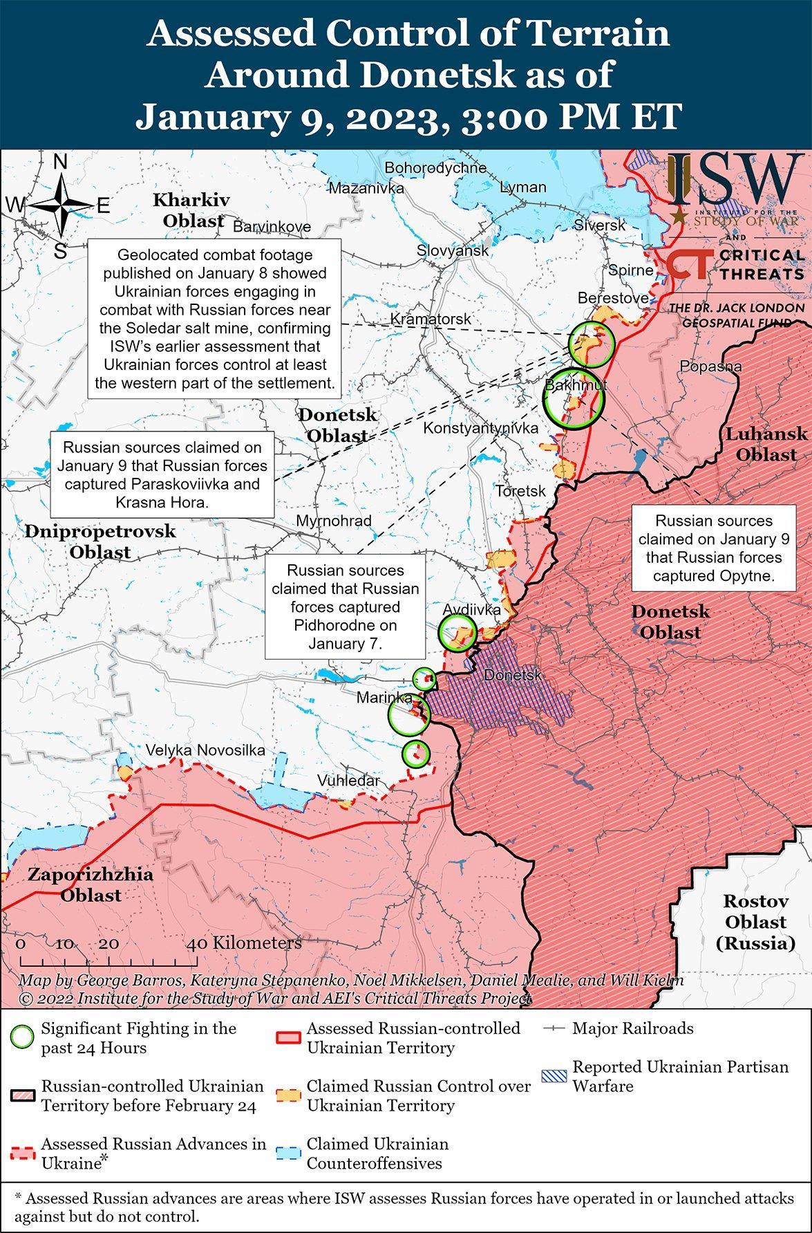 Российские войска продолжали наземные атаки в Соледаре и его окрестностях 8 и 9 января. Украинские военные чиновники подтвердили, что, хотя российские войска не полностью контролируют Соледар, ситуация в поселении чрезвычайно сложная, и персонал группы Вагнера продвигается в определенных районах. Российские блогеры утверждали, что силы группы Вагнера воюют в центре Соледара, а кадры, опубликованные 9 января, показывают интенсивный обмен стрелковым оружием возле административного здания Соледара. Российский милблогер отметил, что украинские войска сохраняют контроль над предприятием «Артемсоль» и прилегающими к нему высотными зданиями на севере Соледара. Российские источники также утверждали, что российские войска взяли под контроль Бахмутское (к юго-востоку от Соледара), Красную Гору и Парасковьевку (к юго-западу от Соледара); и что бои продолжаются в Берховке (10 км к юго-западу от Соледара вдоль трассы Е40 Бахмут-Славянск), хотя ISW не наблюдал визуального подтверждения этих российских утверждений. Генеральный штаб Украины отметил, что украинские войска отразили российские атаки на Соледар, Красную Гору, Подгородное и Роздоловку в период с 8 по 9 января.