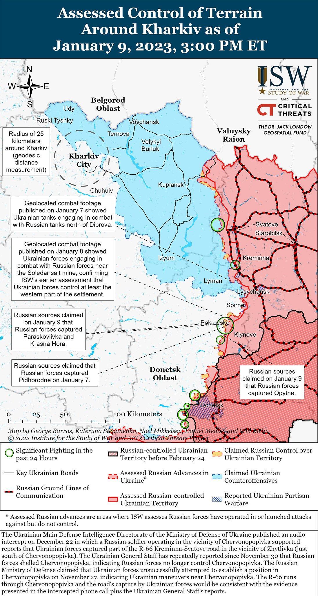Российские и украинские войска продолжали наступательные действия вдоль линии Сватово-Кременная 8 и 9 января. Украинский Генеральный штаб сообщил, что украинские войска отразили российские атаки на Стельмаховку (15 км к северо-западу от Сватово) 8 и 9 января. Министерство обороны России заявило, что российские войска нейтрализовали украинские диверсионные группы к северо-западу от Сватово вблизи Котляровки, Новоселовского и Дворичной. Российский милблогер утверждал, что украинское командование ротирует силы вдоль линии Купянск-Сватово. Российские войска также продолжали ограниченные наземные атаки, чтобы вернуть утраченные позиции возле Кременной 8 и 9 января. Украинский Генеральный штаб заявил, что российские войска атаковали вблизи Макеевки (22 км к северо-западу от Кременной), Белогоровки (10 км к югу от Кременной) и Червонопоповки (6 км к северу от Кременной). Глава Луганской области Сергей Гай 8 января заявил, что вблизи Кременной продолжаются тяжелые бои и что российские войска перебросили в этот район несколько парашютно-десантных батальонов и тяжелую технику, чтобы удержать линию обороны. 9 января российский милблогер предупредил, что украинские войска готовятся к возобновлению наступления на Лиманском секторе к западу от Кременной и концентрируют технику вблизи Терны (15 км к западу от Кременной). Геолоцированные боевые кадры показывают дуэль между российскими и украинскими танками к юго-западу от Кременной возле Дибровой, что указывает на то, что украинские войска, вероятно, добились успехов в лесной зоне к западу от Кременной. Российские источники продолжали обсуждать украинскую разведывательную деятельность в этом районе к юго-западу от Кременной, особенно в лесных районах вдоль линии Серебрянка-Григорвика в 10 км к югу от Кременной.
