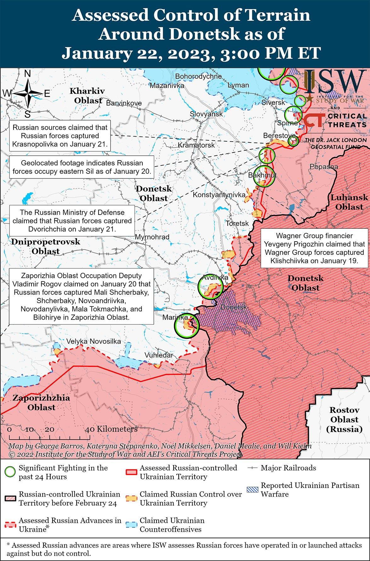 - Российские войска продолжали ограниченные контратаки, чтобы вернуть утраченные позиции вдоль линии Сватово-Кременная 22 января. Российские источники утверждали, что украинские войска нанесли удары по промышленному объекту в Кадиевке Луганской области ракетами HIMARS.