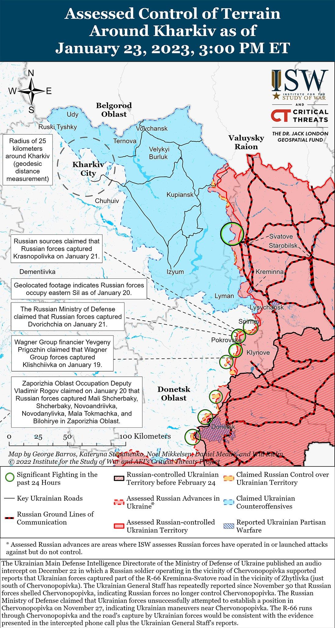 Российские войска продолжали ограниченные наземные атаки, чтобы вернуть утраченные позиции к северо-западу от Сватово 22 и 23 января. Украинский Генеральный штаб сообщил, что украинские войска отразили российские атаки на Стельмаховку (15 км к западу от Сватово) и Новоселевское (15 км к северо-западу от Сватово) 22 и 23 января. На геолоцированных боевых кадрах, опубликованных 22 января, видно, как российские войска ведут штурм украинских позиций в стиле «человеческой волны» вблизи Новоселовского. Российские милблогеры утверждали, что в Новоселовском продолжаются ожесточенные бои, где украинские войска пытаются продвинуться на восток в направлении Куземовки (15 км к северо-западу от Сватово).