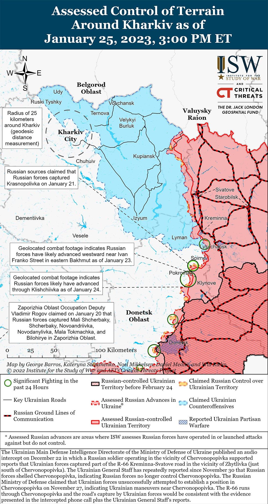 25 января украинские официальные лица признали, что украинские войска вышли из Соледара, и заявили, что линия фронта к северо-востоку от Бахмута стабилизировалась. Пресс-секретарь Восточной группировки войск Украины Сергей Череватый заявил, что украинские войска были выведены из Соледара в неустановленную дату после успешного истощения российских сил в этом районе и предотвращения систематического прорыва России в украинские тыловые районы. ISW ранее оценил, что российские войска, вероятно, захватили поселение 11 января, а Министерство обороны России (МО) заявило, что российские объединенные силы захватили поселение 12 января. Российские войска продолжают наступление вблизи Соледара, а Украинский Генеральный штаб сообщил, что украинские войска отразили российские атаки возле Роздоловка (18 км к северо-востоку от Бахмута) и Красная Гора (7 км к северу от Бахмута). Российский блогер, который, как было подтверждено, сообщал заведомо ложную информацию о российских операциях, утверждал, что боевики группы Вагнера совершили штурм из Подгородного (5 км к северо-востоку от Бахмута) в направлении Ягодное (4 км к северу от Бахмута) и что российские войска пытались атаковать вблизи Спирне (29 км к северо-востоку от Бахмута).
