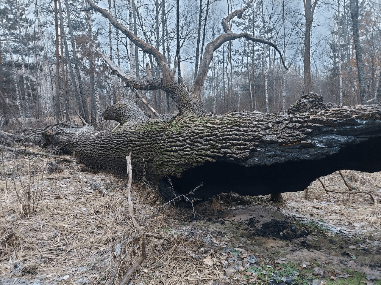 Також, протягом свого нетривалого перебування на території заповідника окупанти цілеспрямовано підпалили віковий дуб, якому було понад 500 років. Внаслідок чого це дерево, яке було одним із найбільш цінних природних об’єктів заповідника, загинуло. Поруч було виявлено ще один дуб, віком понад 100 років, буквально зрізаний влучанням артилерійського снаряду. Цей обстріл також пошкодив адміністративну будівлю заповідника, яка використовувалась працівниками служби державної охорони ПЗФ та науковцями.