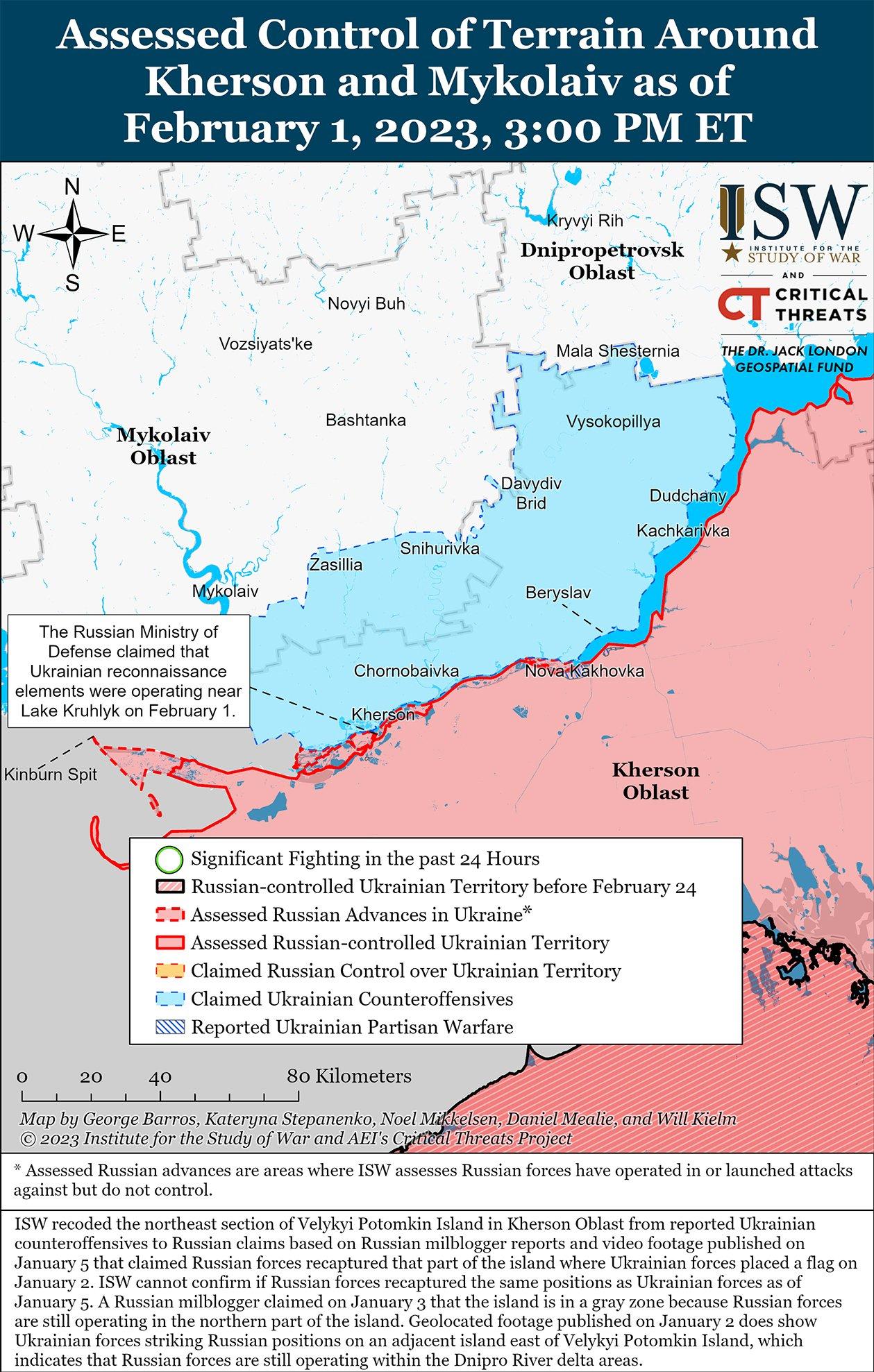 Российские силы продолжают выполнять задачи по разрушению островов в дельте реки Днепр в Херсонской области, чтобы не дать украинским силам закрепиться на островах. Начальник Украинского объединенного координационного пресс-центра Южных войск Наталья Гуменюк заявила 1 февраля, что российские силы увеличивают количество разведывательно-диверсионных попыток в районе дельты Днепра, вероятно, с целью имитации угрозы эскалации на южную часть Херсона. На кадрах с геолокацией, опубликованных 30 января, также, вероятно, видны последствия обстрела украинской артиллерией российских войск, проводивших рейд на один из островов в дельте. Однако Гуменюк отметила, что состав российских сил, погодные условия, рельеф местности и использование гражданских катеров недостаточны для форсирования Днепра. Гуменюк добавила, что сосредоточения сил специального назначения РФ или сил высокой боевой готовности, которые могли бы угрожать западному (правому) берегу Херсонской области, нет. Российские силы не имели возможности удерживать западную Херсонщину с обилием боеприпасов и элитных сил из-за нарушения логистики осенью 2022 года и вряд ли смогут восстановить утраченные позиции в регионе. Министерство обороны России, в свою очередь, заявило, что российские войска уничтожили две моторные лодки и ликвидировали до 10 украинских военнослужащих в районе озера Круглое, примерно в 5 км к югу от города Херсон.