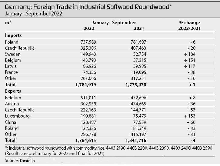 После снижения в двух предыдущих кварталах общий объем экспорта пиловочника хвойных пород за девятимесячный период составил 4,685 млн м³ (6,636 млн м³), что на 29% меньше. Экспорт в пределах ЕС упал на 25% до 2,438 млн м³ (3,236 млн м³) за этот период, а поставки в Китай на 36% до 2,031 млн м³ (3,160 млн м³). Импорт пиловочника составил в общей сложности 2,189 млн м³ (2,718 млн м³), что примерно на 19% меньше, чем за аналогичный период предыдущего года. Положительное сальдо внешней торговли сократилось почти на 37% до 2,496 млн м³ (3,949 млн м³). В случае промышленной древесины хвойных пород импорт немного вырос на 1% до 1,785 млн м³ (1,775 млн м³), в то время как экспорт сократился на 4% до 1,764 млн м³ (1,842 млн м³). Таким образом, соотношение импорта к экспорту является приблизительно сбалансированным.